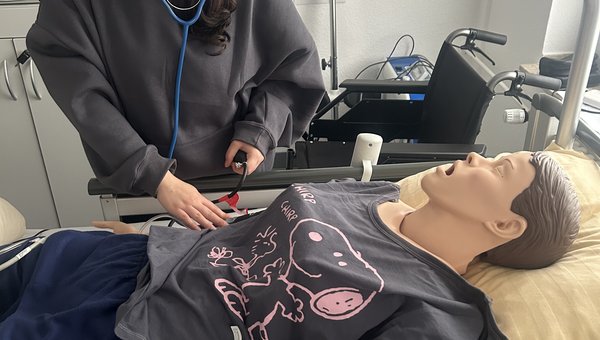 Nachdem der Kurs bei Frau Thüner die theoretischen Grundlagen erarbeitet hatte, ging es an die praktische Übung an der Simulationspuppe Nursing Anne. Die Lehrkraft Frau Wolff konnte dabei Blutdruck und Puls manuell einstellen und flexibel verändern. So konnten die Auszubildenden ihr Wissen direkt…