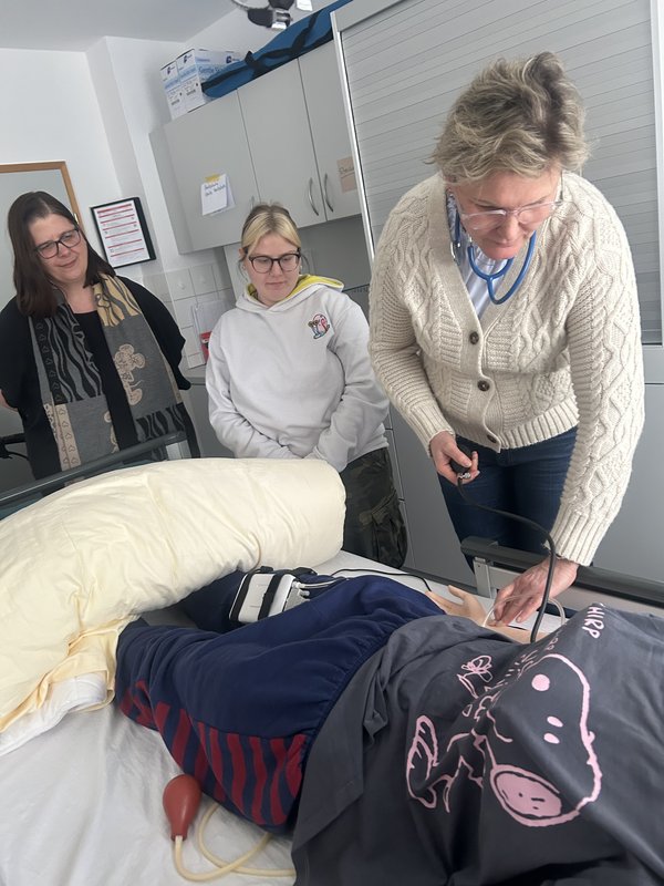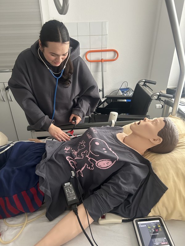 Nachdem der Kurs bei Frau Thüner die theoretischen Grundlagen erarbeitet hatte, ging es an die praktische Übung an der Simulationspuppe Nursing Anne. Die Lehrkraft Frau Wolff konnte dabei Blutdruck und Puls manuell einstellen und flexibel verändern. So konnten die Auszubildenden ihr Wissen direkt anwenden und ihre Methodenkompetenz weiter stärken.