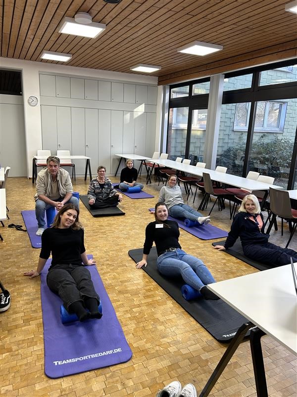 Nach dem theoretischen Teil wurden wir selbst aktiv. Mit einer Faszienrolle führten wir verschiedene Übungen durch, die nicht nur gut getan haben, sondern auch direkt spürbar waren. Nach dieser praktischen Einheit gingen wir alle mit einem guten und entspannten Gefühl zurück an unsere Arbeit.